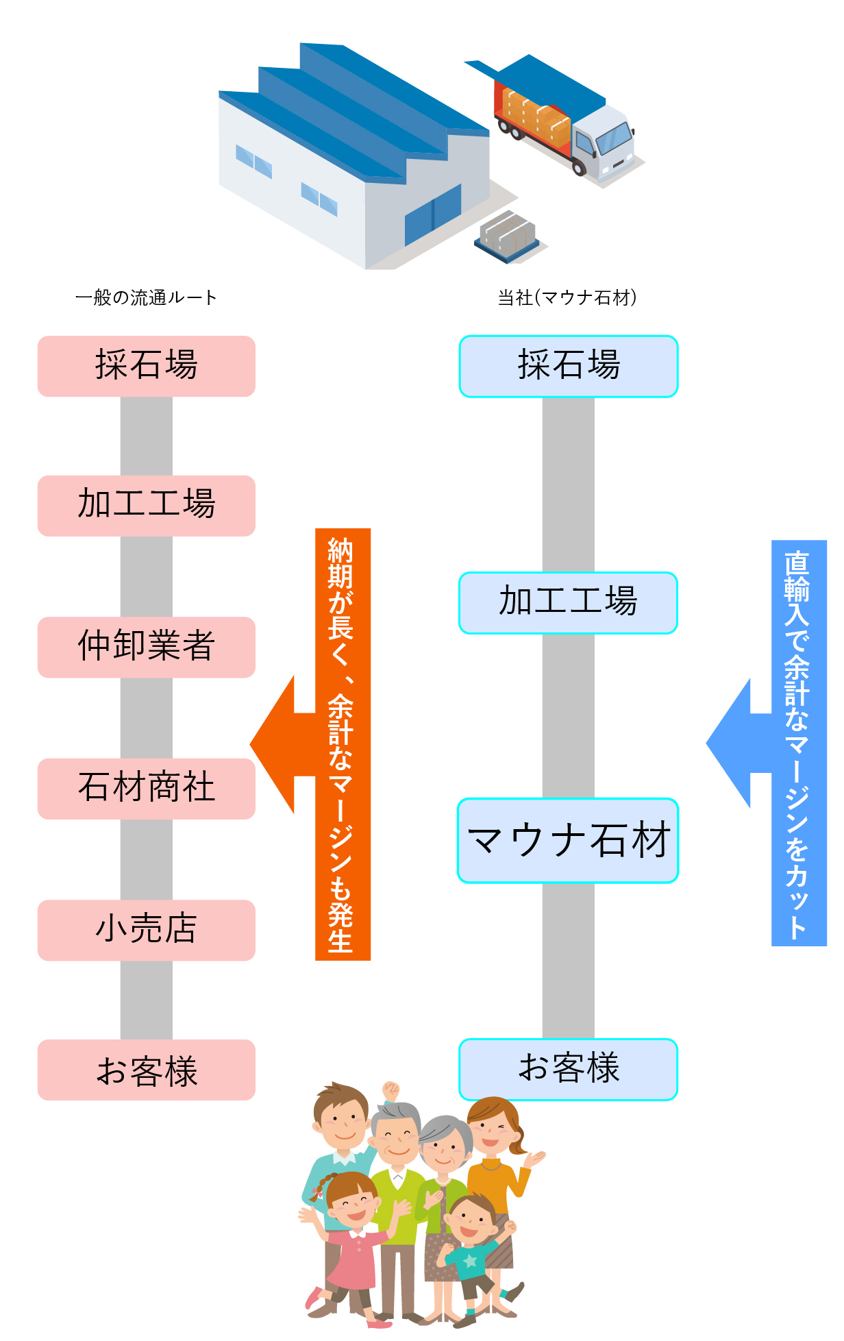 国内の石材商社や中国の仲卸業者を通さずに、当社が中国工場から直接輸入しているため品質を保ったまま、安価でのご提供が可能となっています。